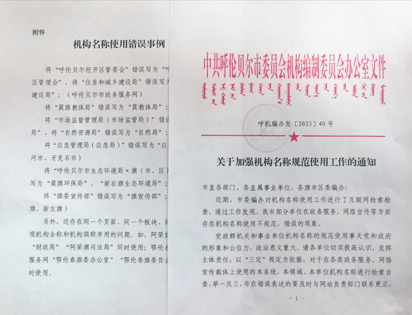 为进一步提高机构编制管理精细化、规范化水平,维护“三定”规定的权威性和严肃性,呼伦贝尔市委编办采取“一查二检三通知”的方式,加强对市直及各旗市区党政群机关、事业单位的机构名称规范使用工作。
