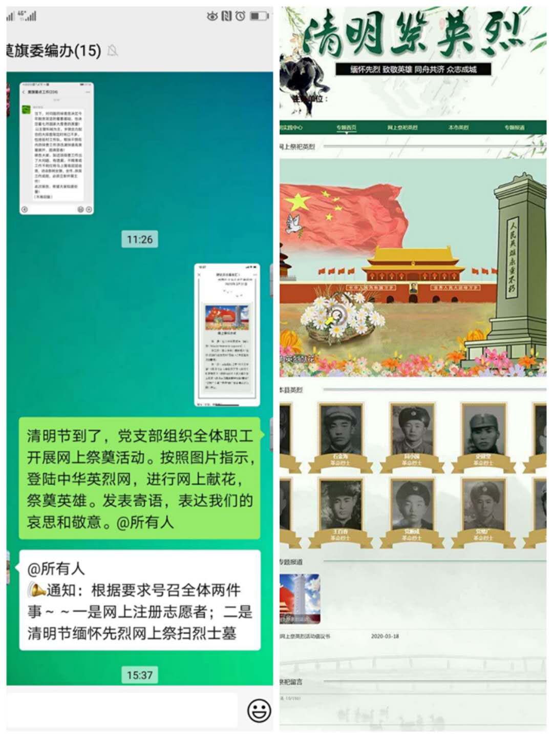 清明节是中国传统节日,在这缅怀先辈、寄托哀思的重要时节,正是全国上下众志成城,坚决打赢疫情防控阻击战的关键时期。为避免清明祭扫引发的人流聚集,摒弃传统祭祀陋习,树立文明祭祀新风,莫旗委编办党支部组织全体干部职工通过登陆中华英烈网进行网上献花、点烛、上香、祭拜、写寄语等形式,表达对烈士们的哀思和敬意。缅怀英烈,贵在心意,重在文明,此次活动充分宣传了“摒弃陋习、文明祭奠”的新理念。