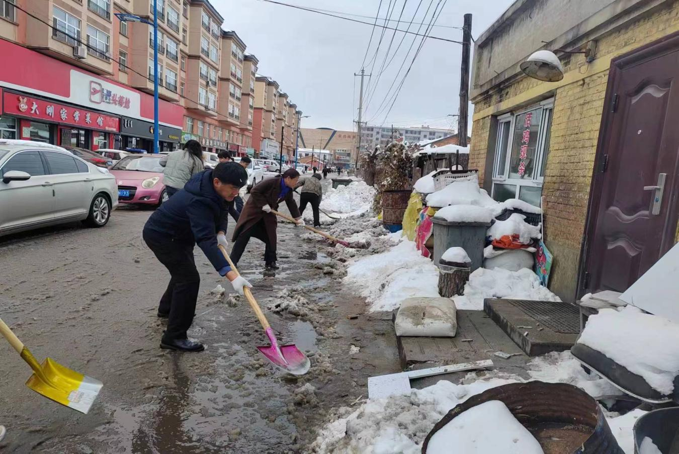 强降雪后,为切实做好清雪除冰工作,市委编办全体党员干部,不畏严寒,带着铁锹,铁铲等工具奔赴立新街的庆和路育林路南侧。迅速动员社区干部和群众以及沿街商户同频联动开展清雪工作。深入到每个商户家中,动员落实“门前五包”责任制,开展“门前五包”积雪即下即清行动,商户积极落实“门前五包”,对“门前五包”范围内道路两旁的积雪进行清理,为居民出行扫出一条“爱心通道”。大家齐心协力,协调各种清雪设备,分工明确、干劲十足、清除积雪,有效保障了居民的出行安全。