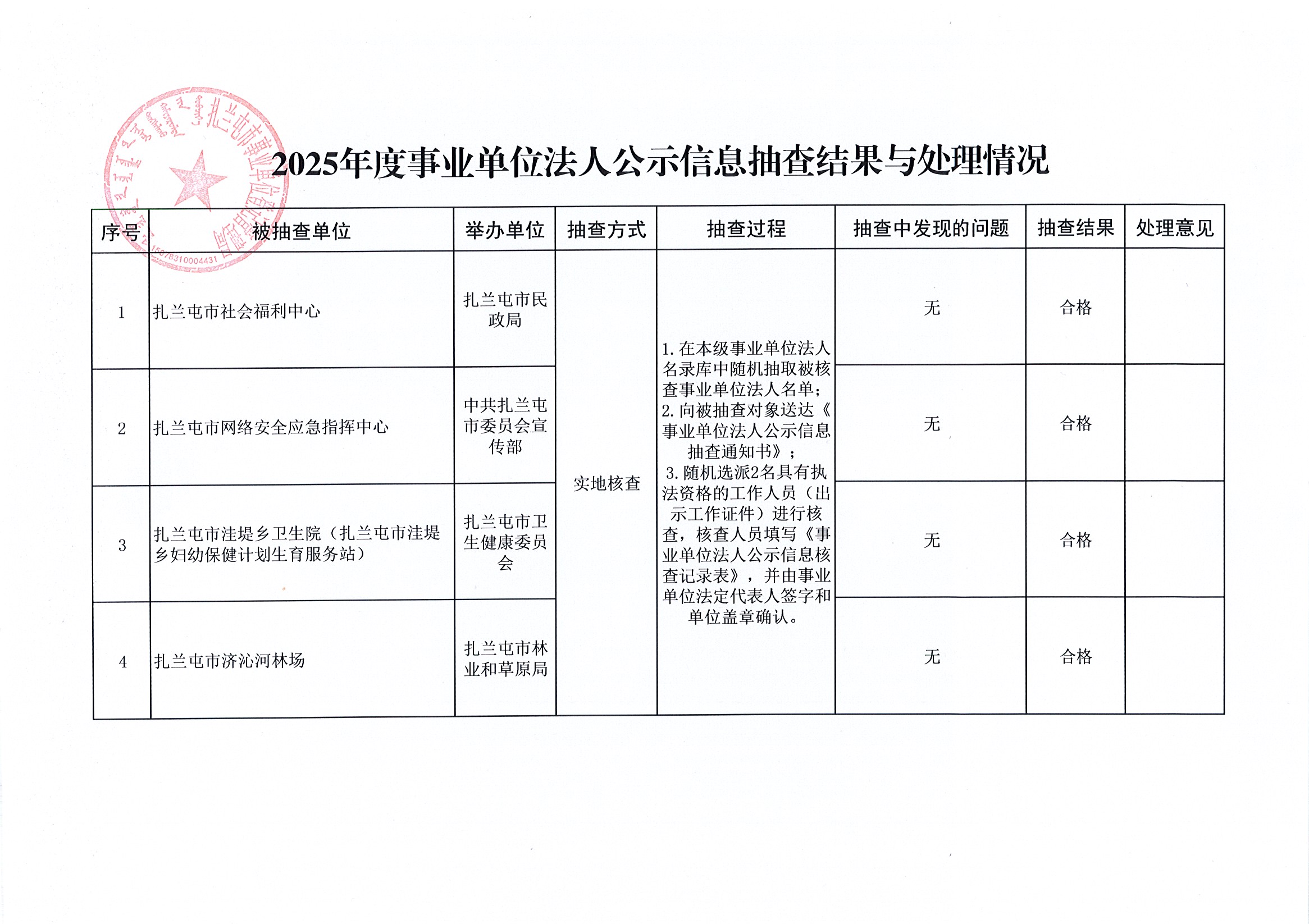 2025年度事业单位法人公示信息抽查结果与处理情况